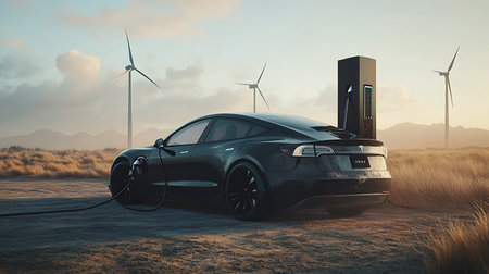 An electric vehicle charges at a wind farm showcasing sustainable transport in a beautiful landscape.