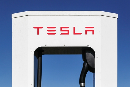 Hedensted, Denmark - May 5, 2018: Tesla supercharger station. Tesla is an American automotive and energy storage company that designs, manufactures, and sells luxury electric cars