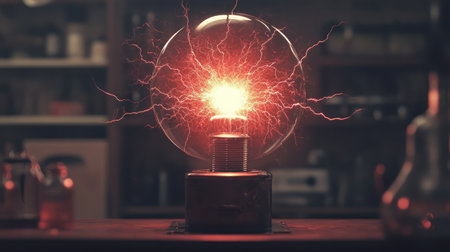 An electrifying image showcasing a tesla coil generating stunning red lightning bolts in a laboratory. The background features a softly blurred workspace filled with scientific tools.