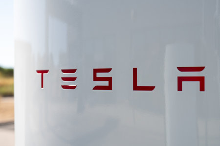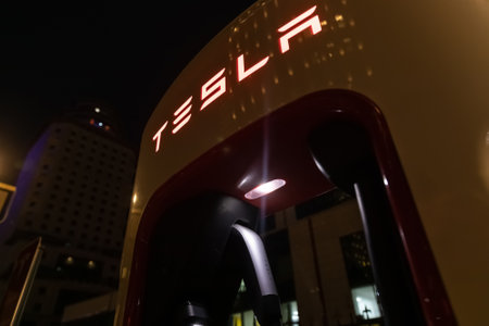 Tarragona, Spain - September 27, 2023: Electric car charging station Tesla Supercharger.