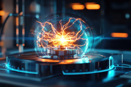 A plasma sphere emits bright electric arcs in a sleek laboratory, showcasing advanced technology and energy.