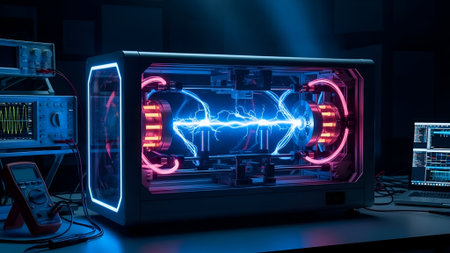 A powerful, glowing energy core with blue plasma and red neon lights sits on a dark lab bench, symbolizing advanced scientific innovation and future tech.