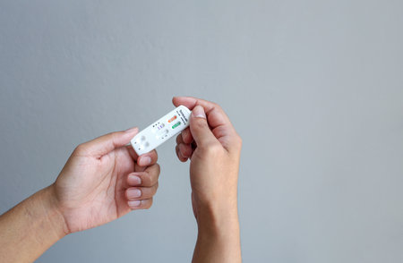The test result for COVID-19 is negative, not infected, using rapid testing equipment. Test for coronavirus on the hand, white background. Copy space. Testing Concept Coronavirus Disease infection.
