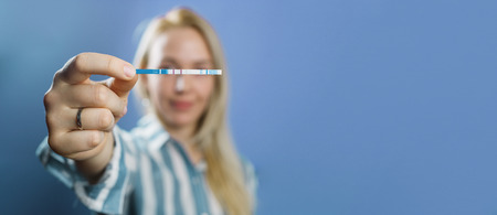 Two Covid-19 tests: one negative, one positive on the right. Blue background. Copy space.
