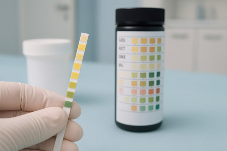 Gloved hand holding urine test strip with reagent bottle in laboratory setting for medical analysis