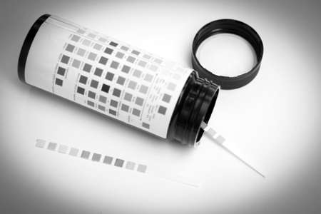 urine sample along with dip stick uristix for analyzing urine glucose protein in diabetes