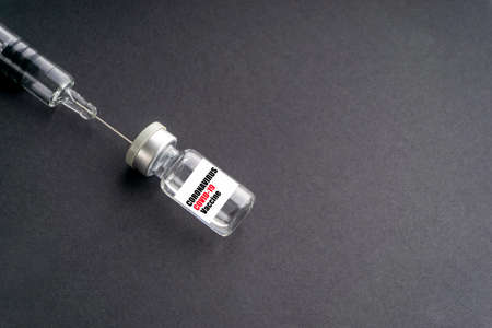 CORONAVIRUS COVID-19 VACCINE text with syringe and vials on black background. Covid-19 and Coronavirus concept