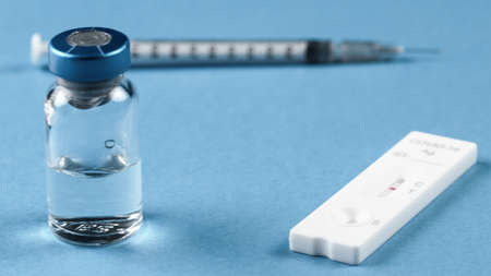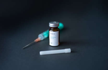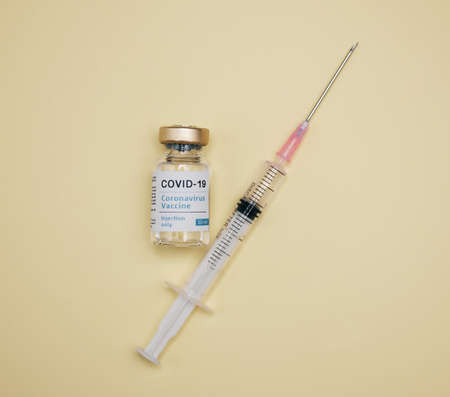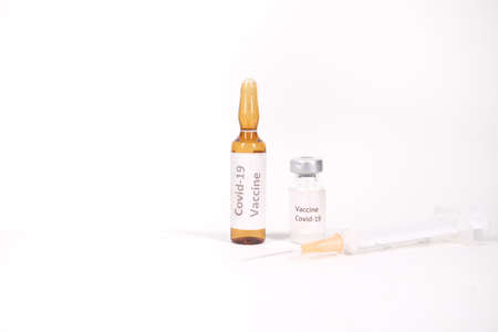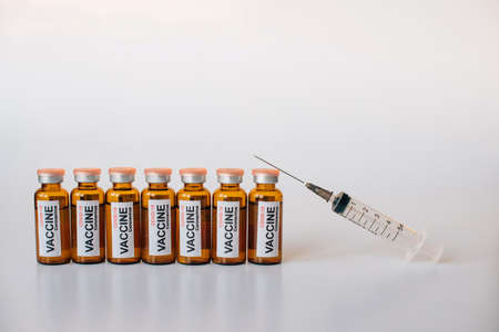 ampoules with Covid-19 vaccine on a laboratory on the table, syringe