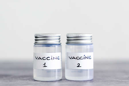 vaccine race and immunisation against the pandemic, ampoules with Vaccine 1 and Vaccine 2 labels side by side referring to etiher the first and second shot or different vaccine options