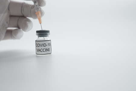 Covid-19 vaccination background on a white background, vaccine vial with syringe, blue gloves