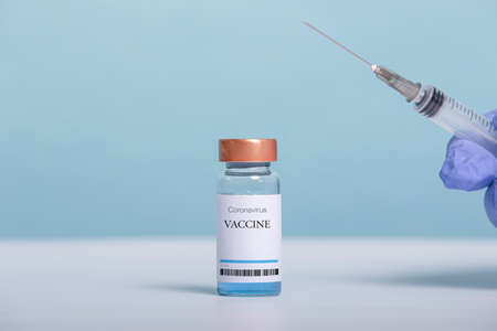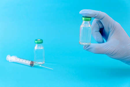 hand in a blue glove holds a syringe near a vial with a vaccine against coronavirus on a blue background. Space for text