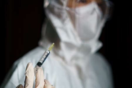Vaccination against coronavirus. Ampoule with a vaccine. In the hands of a syringe for injection. Hands in rubber gloves. Close-up shot.