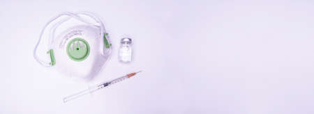 Glass vial for intramuscular injection containing the vaccine for covid-19 with syringe and needle on white background, Covid-19 coronavirus vaccine concept, on a table with medical supplies, copy space