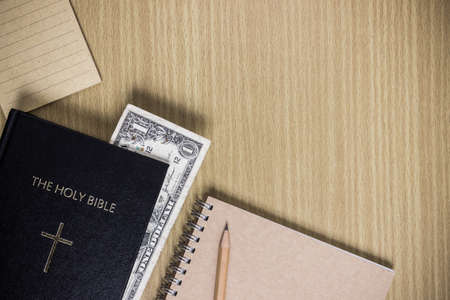 Open Holy Bible on a brown wooden table.Open Holy Bible top view.Religious concept.