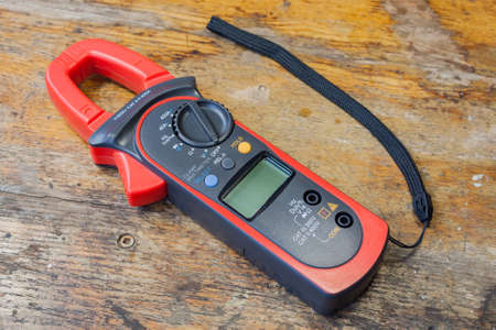 Multimeter measuring device electric tool for measurement of voltage lying on wooden floor background