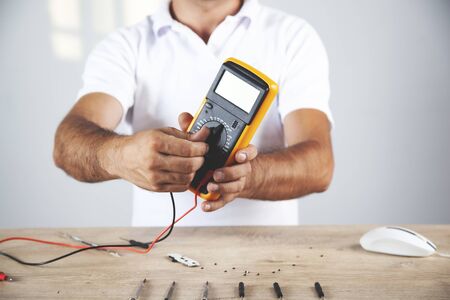 The close-up of the multimeter is on the table. measuring voltage with a tester.