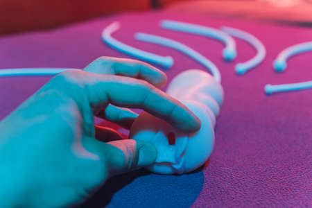 Doctor's hands in rubber gloves holding a model of the prostate