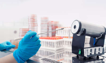 Taking out test tubes. Close up of hands in sterile gloves taking the test tubes out of centrifuge