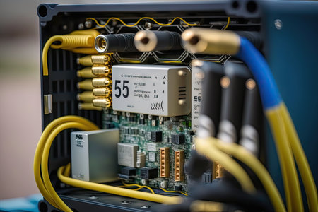 close-up of 5g network equipment, with cables and connectors visible, created with generative ai