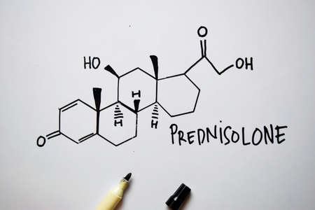Prednisolone molecule written on the white board. Structural chemical formula. Education concept