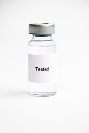 Vaccine concept, an Isolated medical vial with a label reading Tested on a plain white background.