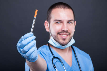Medicine, vaccination and healthcare concept - male nurse with stethoscope and syringe on yellow color background