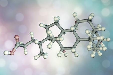Cholic acid molecule, 3D illustration. A major primary bile acid produced in the liver, it facilitates fat absorption and cholesterol excretion