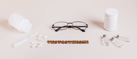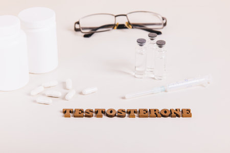 Syringe, ampoules and capsules for regulating testosterone levels on a light background