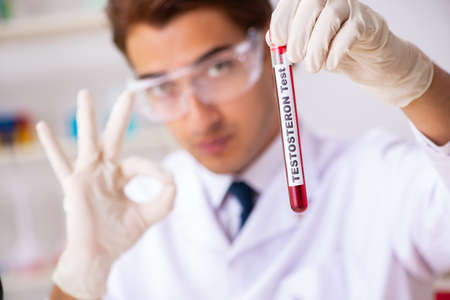 Young handsome lab assistant testing blood samples in hospital
