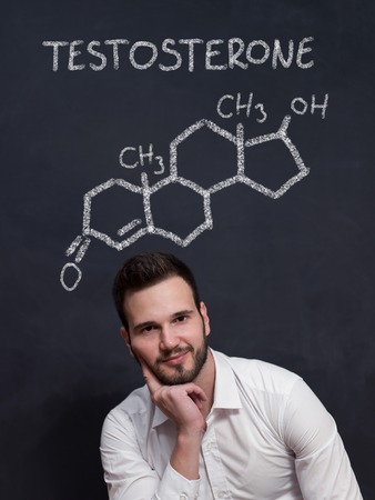Chemical structure of testosterone molecule drawn on chalkboard background with man in front of it