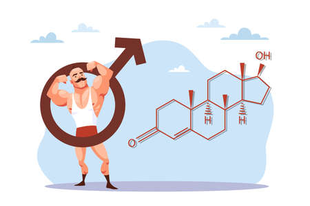 Doping to increase muscle mass for unhealthy athletes, testosterone chemical formula. Funny strong man with moustache demonstrates muscles, male sport, gym training. Vector cartoon concept