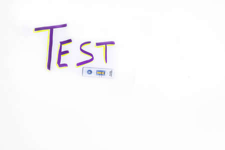 Poster with copy space where they put some letters TEST and a detector or antigen test for Covid19 on a white background concept health disease and pandemic.