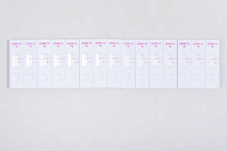 Close-up of virus rapid antigen test negative outcome bunch of test kits laying on laboratory surface