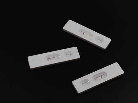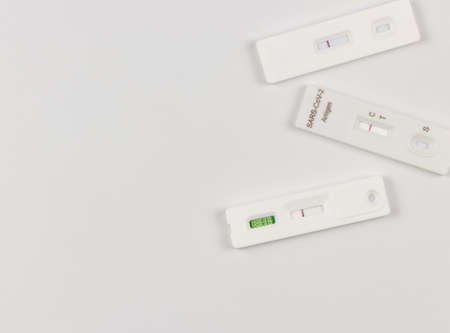 Top view or flat lay of three negative test result antigen test kits (ATK) on white background with copy space. Antigen test kits for self collect nose swab.