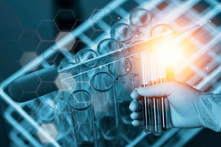 A scientist or researcher in a laboratory holds a test tube to invent a vaccine against the coronavirus. Concept of treatment Medical experiments prevent the spread of the covid-19.