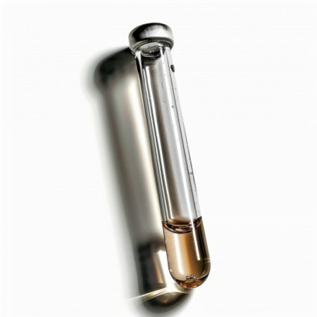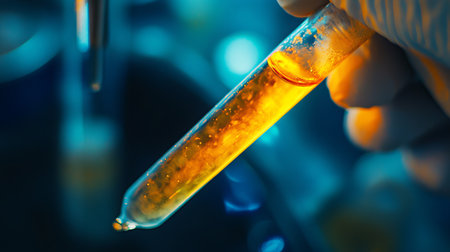 Close-up shot of a scientist's hands holding a glass test tube filled with liquid Chemical substance