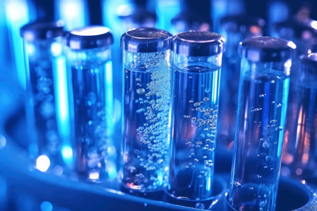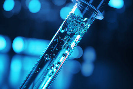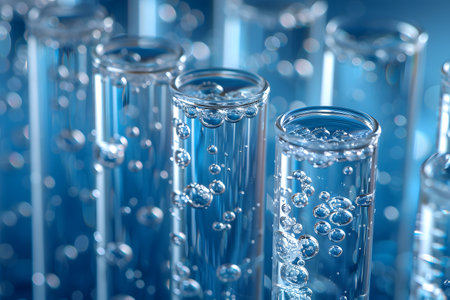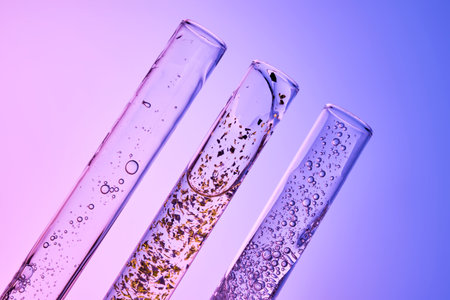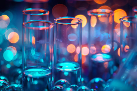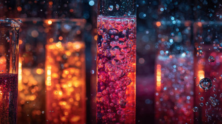 Discover a mesmerizing scene featuring colorful liquid bubbles in test tubes, enhanced by water drops and stunning bokeh effects, perfect for scientific themes.