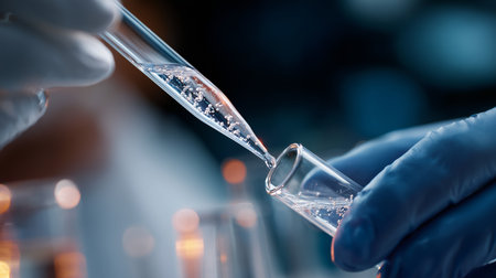 Chemist performing an experiment with test tubes and clear liquid in a laboratory setting