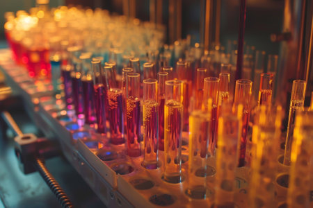A medical laboratory bathed in soft, warm light, with test tubes filled with colorful liquids arranged in a unique pattern