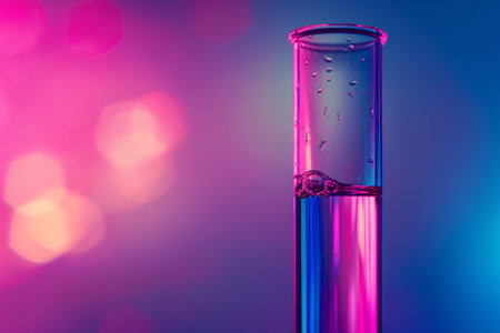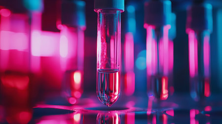 A close-up view of a test tube filled with liquid, surrounded by pink and blue neon lighting in a laboratory setting, representing science, research, and modern technology.