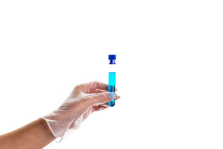 A scientist's hand in a glove holding a glass test tube with a blue liquid inside, color tones. close-up