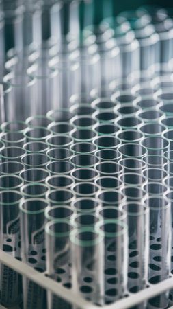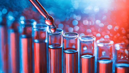 Dynamic image of a test tube row in a science lab, featuring a precise droplet falling from a dropper into a vibrant liquid. Highlights innovation in medicine, chemistry, and laboratory research.