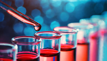 Image of a row of test tubes being filled with liquid droplets using a dropper, symbolizing medical and science laboratory processes, highlighting research, chemical analysis, and modern