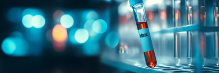 Mpox virus test tube glowing in laboratory light with bokeh in the background. A dramatic representation of virus research and prevention.
