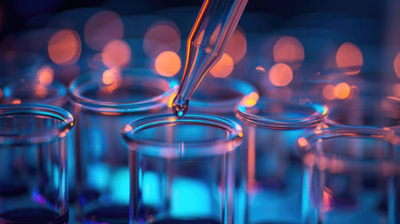 Dropper releases droplet of liquid into test tubes closeup image, ai generated. Laboratory experiment close up photography. Blue bokeh background. Scientific research concept photo realistic