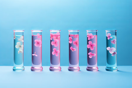 Delicate flowers float gracefully in transparent glass vases filled with colorful water. The vivid hues of pink and blue create a mesmerizing effect, capturing the essence of tranquility and beauty.