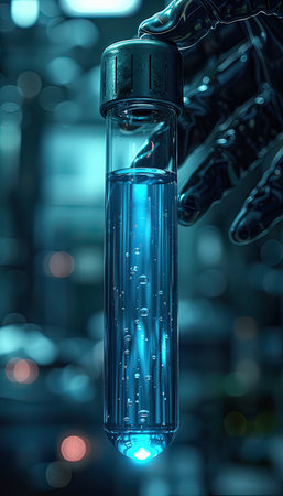 Scientist holding blue liquid in beaker, analyzing chemical for research generated by artificial intelligence