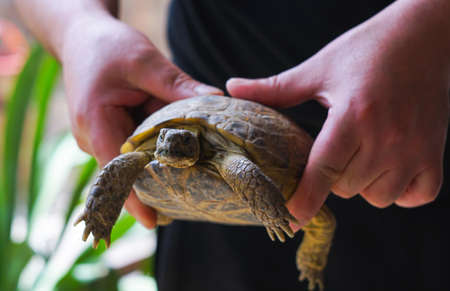 Strong male hands gently holding turtle. The attachment to the pet. Close-up. Turtles day