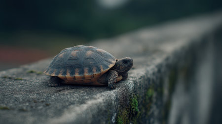 A small turtle crawls cautiously along a stone wall, showcasing its textured shell amidst a peaceful, natural setting filled with greenery.
