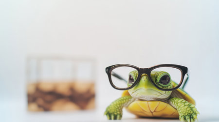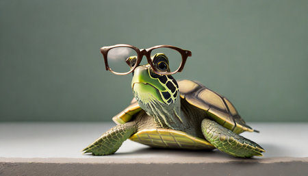 Adorable turtle with glasses, posed against a softfocus background, cute and quirky